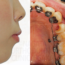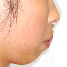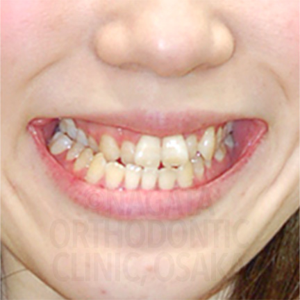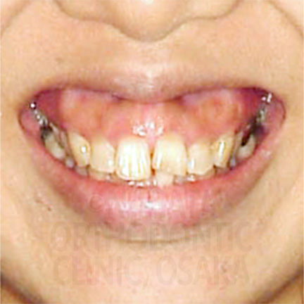 著しい叢生と前歯が噛み合わない開咬、またあごの後退が認められ骨格的な改善が必要と判断し外科的矯正治療を計画しました。 上下左右の第一小臼歯を抜歯し、約1年半の術前矯正を行い手術に適した歯列をつくります(写真3枚目)。 その後外科手術にて上顎の骨を後方に、下顎は前方に移動、オトガイの形態も整えました(写真4枚目)。術後は顎を固定し、徐々に安定させていきます。 治療後は開咬と叢生が改善し、しっかり噛める歯ならび・バランスの取れた口元となりました。リスク・副作用 - 装置交換当日から2-3日、噛み合わせると違和感(歯が浮いたような感じ、噛むと痛い)がある。