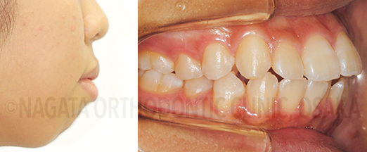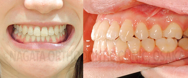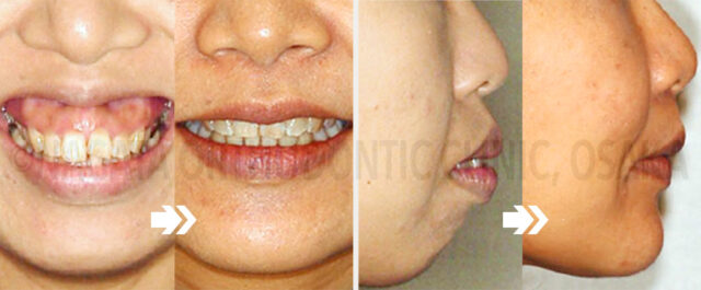 笑ったときに歯ぐきが大きく見える「ガミースマイル」と、下あごが後ろに下がっている、口元が突出していることを気にして来院されました。矯正治療に加え、外科的な処置も行って治療を進め、歯ならびやかみ合わせを整えつつ口元と横顔のバランスを改善しました。治療後は自然な笑顔になり、印象も大きく向上しました。リスク・副作用 - 装置交換当日から2-3日、噛み合わせると違和感(歯が浮いたような感じ、噛むと痛い)がある。