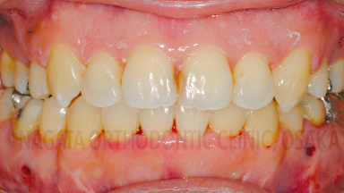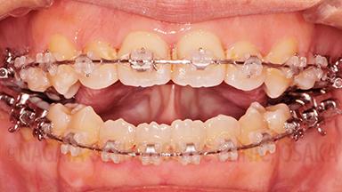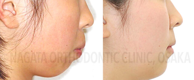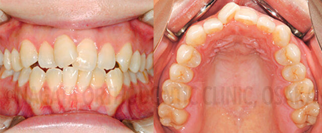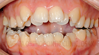 著しい叢生と前歯が噛み合わない開咬、またあごの後退が認められ骨格的な改善が必要と判断し外科的矯正治療を計画しました。 上下左右の第一小臼歯を抜歯し、約1年半の術前矯正を行い手術に適した歯列をつくります(写真3枚目)。 その後外科手術にて上顎の骨を後方に、下顎は前方に移動、オトガイの形態も整えました(写真4枚目)。術後は顎を固定し、徐々に安定させていきます。 治療後は開咬と叢生が改善し、しっかり噛める歯ならび・バランスの取れた口元となりました。リスク・副作用 - 装置交換当日から2-3日、噛み合わせると違和感(歯が浮いたような感じ、噛むと痛い)がある。