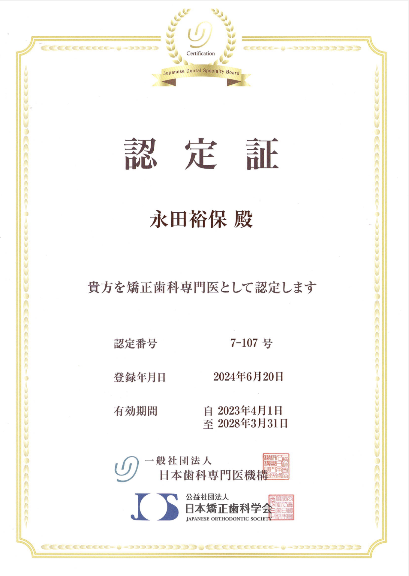 2025年12月26日 「矯正歯科専門医認定証」が届きました 2023年4月1日(第1回)承認者として認定を受けました、日本歯科専門医機構の「矯正歯科専門医」の認定証が届きました。 矯正歯科専門医をわざわざ調べて来院くださる方も増えてきました。 今後も矯正歯科専門医としての知識・技術の向上に努め、患者さんに丁寧に寄り添い、納得のいく歯科矯正治療を提供してまいります。 第1回認定の矯正歯科専門医(全国201名)の一覧はリンクURLで確認可能です。